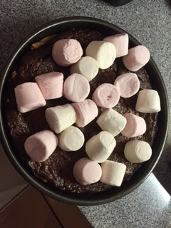 To make the topping, heat the grill to high, then top the pie with marshmallows so they cover the surface evenly. Put small pieces of foil around the pastry edges to stop them burning then put the pie under the grill and cook until the marshmallows are scorched, campfire style, around 2 minutes [from the picture in the book I thought the marshmallows were supposed to melt which they didn't really do, so I left them under the grill too long and the tops burnt! I managed to lift the burnt parts off and then it did look much better].