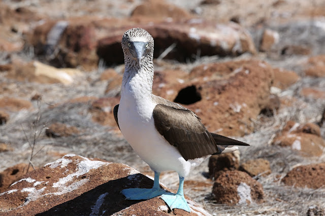 We saw several of the famous blue-footed boobies and witnessed them do their mating dance –where they lift one foot in turn as if to say ‘look how blue my feet are!’. We saw several chicks and some boobies nesting on eggs, then we came across the magnificent frigate birds which have red pouches under their chins that are huge when inflated. There were land iguanas – a different colour to the marine iguanas we saw yesterday – but really this island is a bird watcher’s paradise.