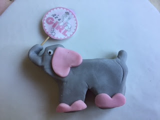 I had these baby girl wafer decorations left from a previous baby shower and didn't want to use them on the cake itself but had an idea after seeing a picture of an elephant holding a balloon - I stuck it onto a cocktail stick and put that in the elephant's trunk.